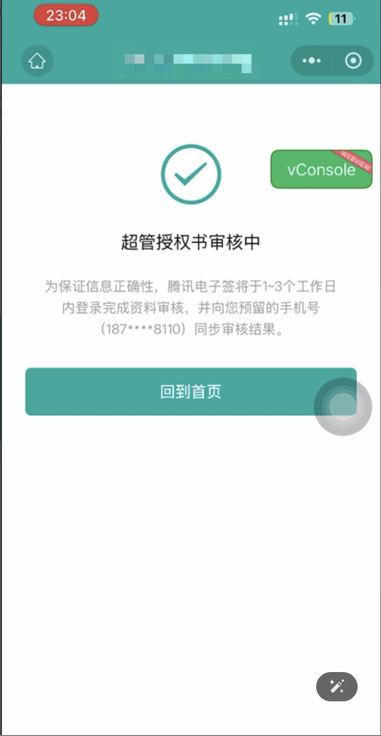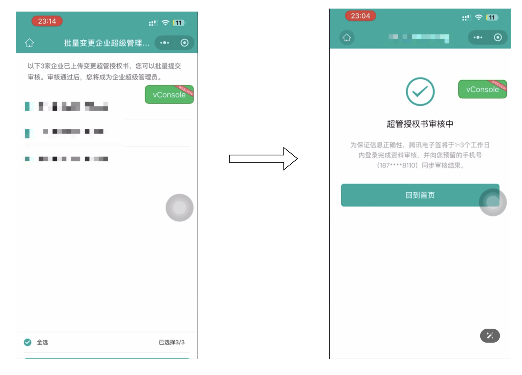 将步骤4中生成的认证单链接给到传入的超管(比如以上示例中给到"王刚"),超管打开链接做批量认证(演示视频)。授权书批量提交成功后,会由腾讯电子签专员进行审核, 各企业的审核结果会通过回调进行通知。 (如果是法人操作批量认证,无需授权书直接扫脸即可,演示视频。)
