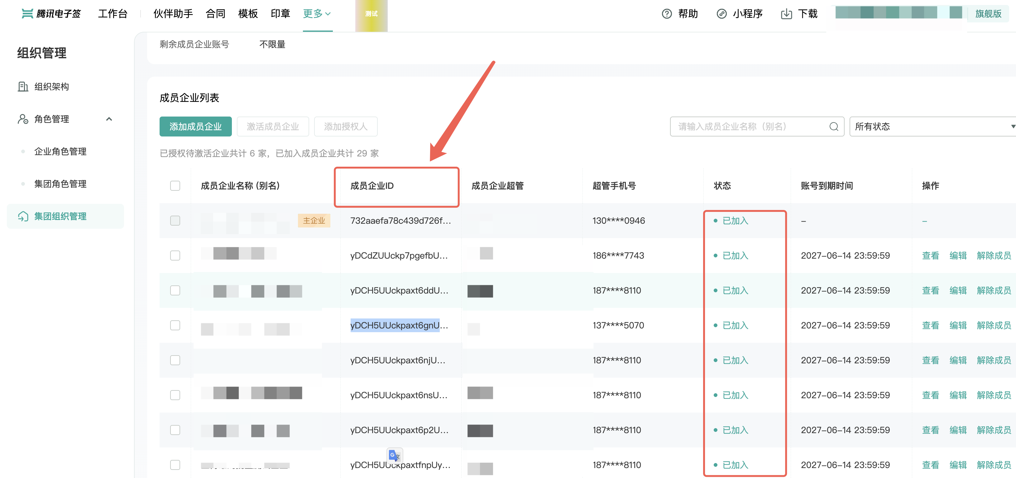 集团成员企业可以在电子签控制台 更多 - 组织管理 - 集团组织管理 处获取。