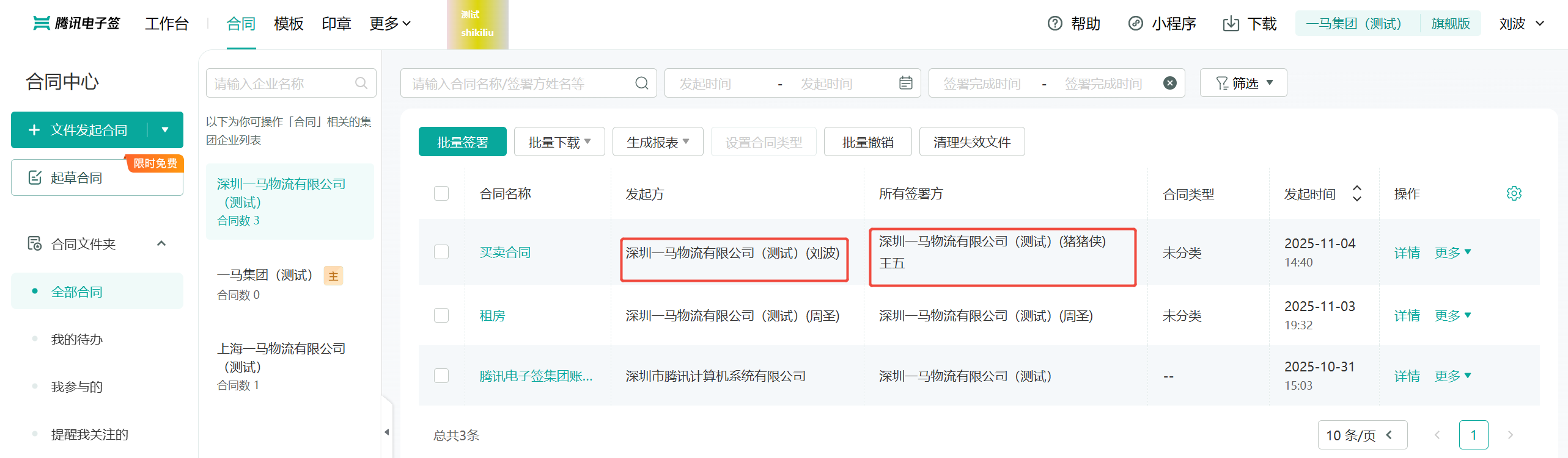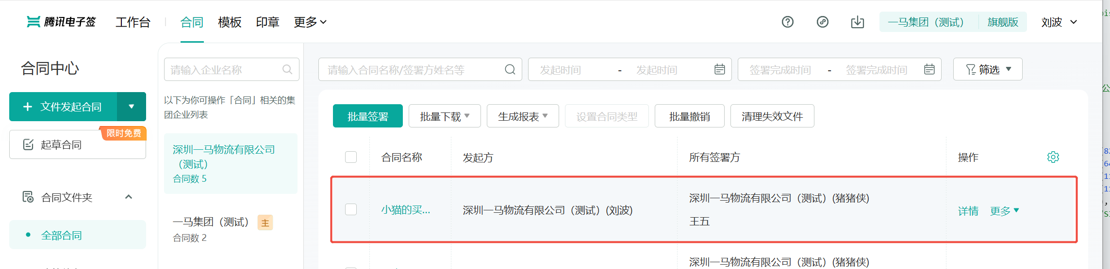 - 合同发起后,列表中会显示该合同。注意合同发起方会显示为子公司(例如“深圳一马物流有限公司 — 刘波”)。即便刘波未加入子公司,只要其具备集团组织权限,仍可代表子公司发起和参与签署。