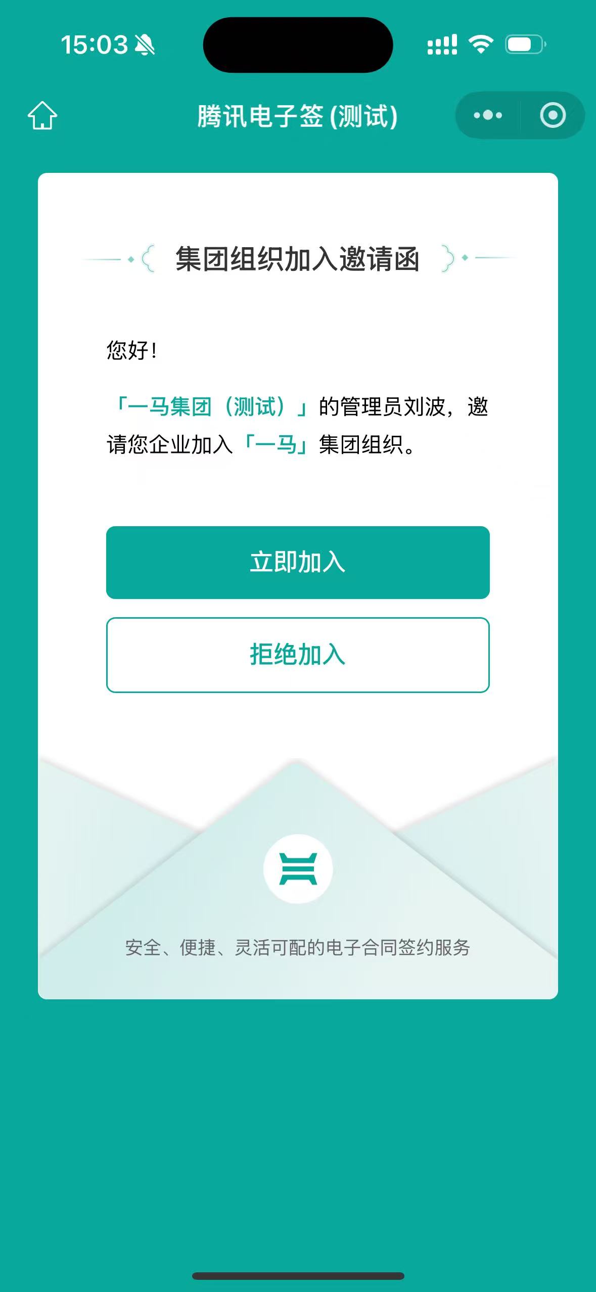 周圣扫码后进入 集团组织加入邀请函 页面,界面显示“一马集团”邀请其加入集团组织,界面示例如下: