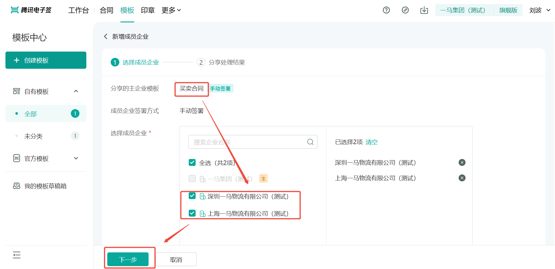 在分享界面选择要分享的子企业,确认模板无误后点击下一步开始执行分享动作。
