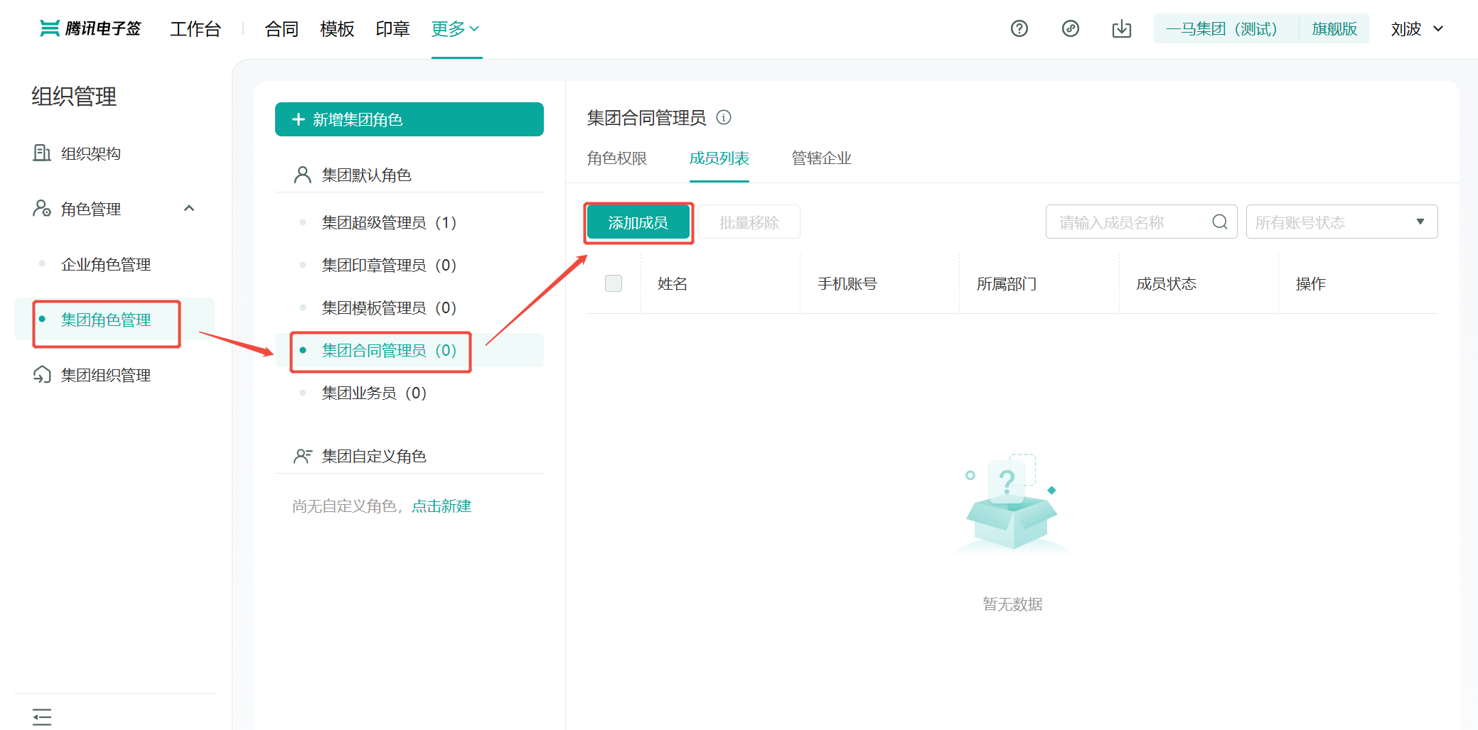 主企业超级管理员可登录控制台,依次进入 更多 -> 企业组织 -> 集团角色管理 页面,选择相应的集团角色权限后,点击右侧 成员列表 中的 添加成员,将指定主企业员工赋予对应权限。操作示例如下图: