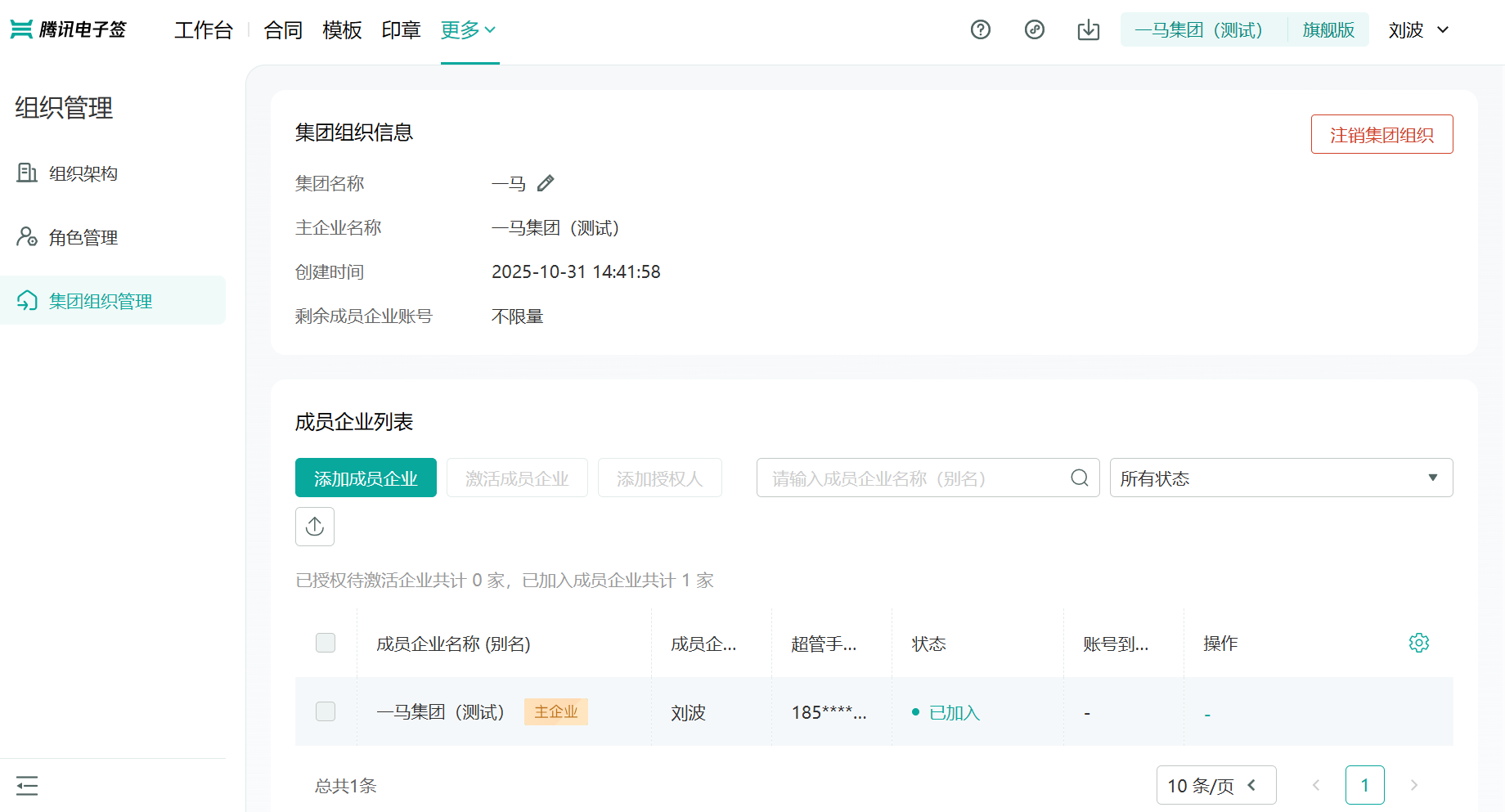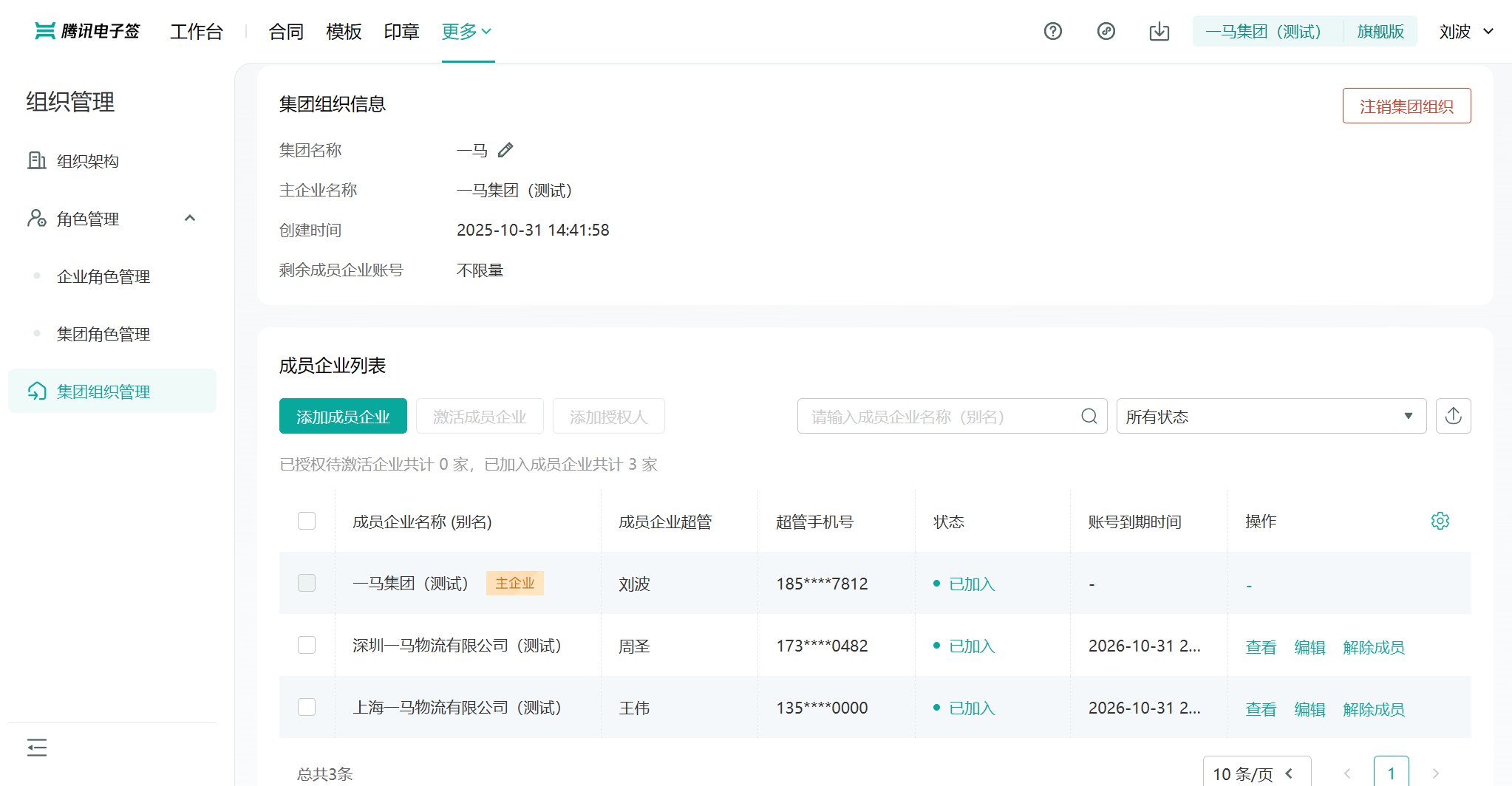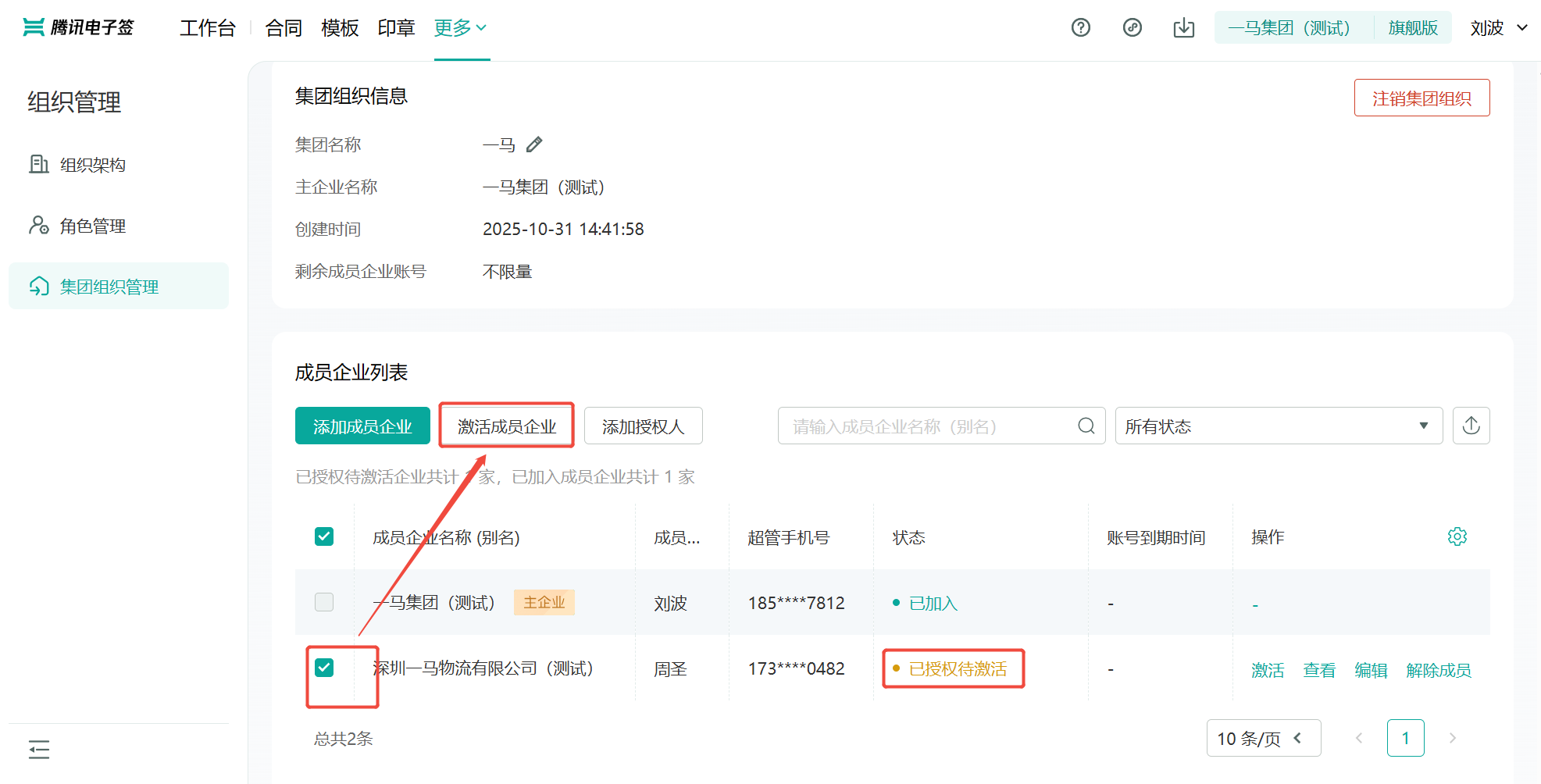 另一家公司上海一马物流有限公司的超级管理员王伟也扫描邀请二维码申请加入后,经主企业激活,当前集团组织已有两个已激活的子企业,界面显示如下: