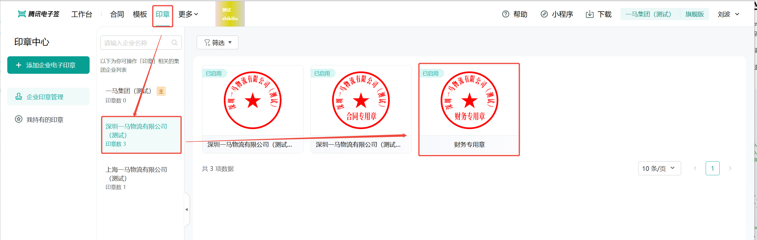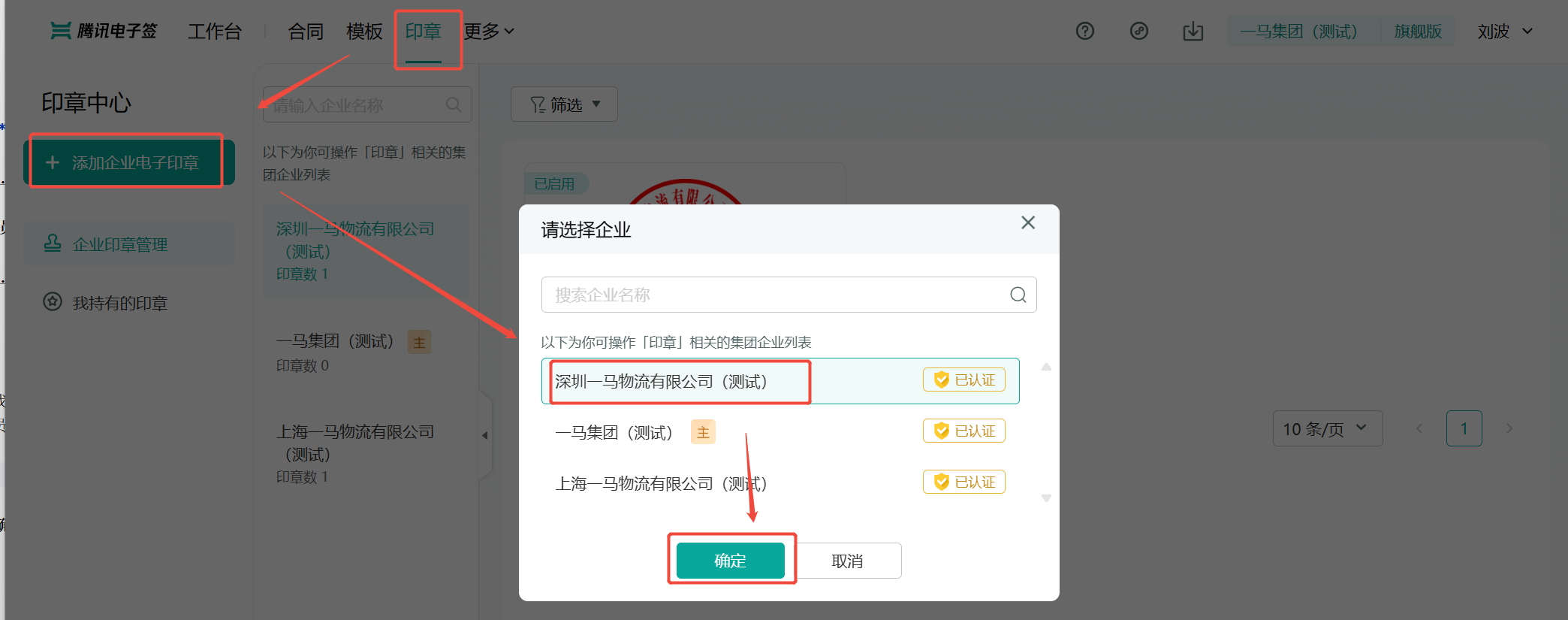 主企业现在可以统一管理子企业的合同模板、印章等资源。以下以给子企业深圳一马物流有限公司创建一个合同专用章为例进行说明。