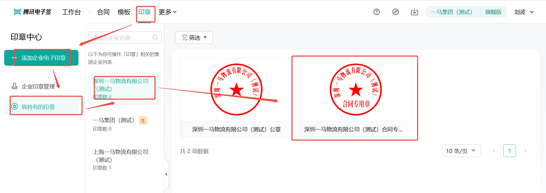 创建成功后,可通过依次点击 印章 -> 我持有的印章,选择对应子企业,即可查看刚创建的印章,界面如下: