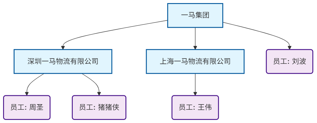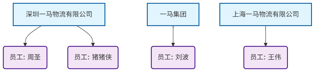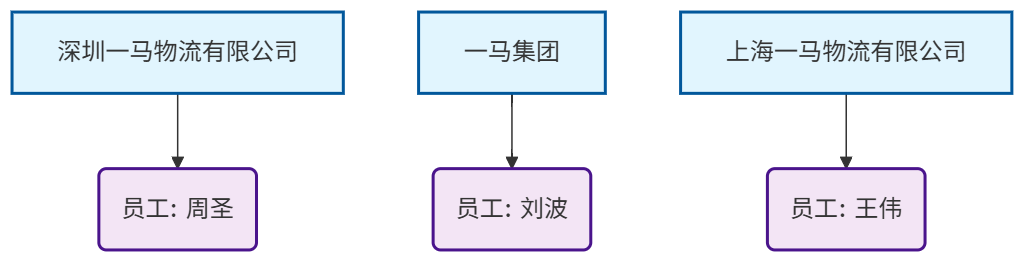 示例中,刘波完成了一马集团的注册认证,周圣完成了深圳一马物流有限公司的认证,王伟完成了上海一马物流有限公司的认证,整体架构关系如下: