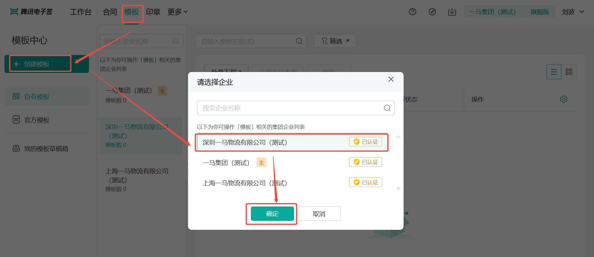 依次点击 模板 -> 创建模板 -> 选择对应的子企业 -> 点击确定,进入子企业的模板创建页面并完成配置。