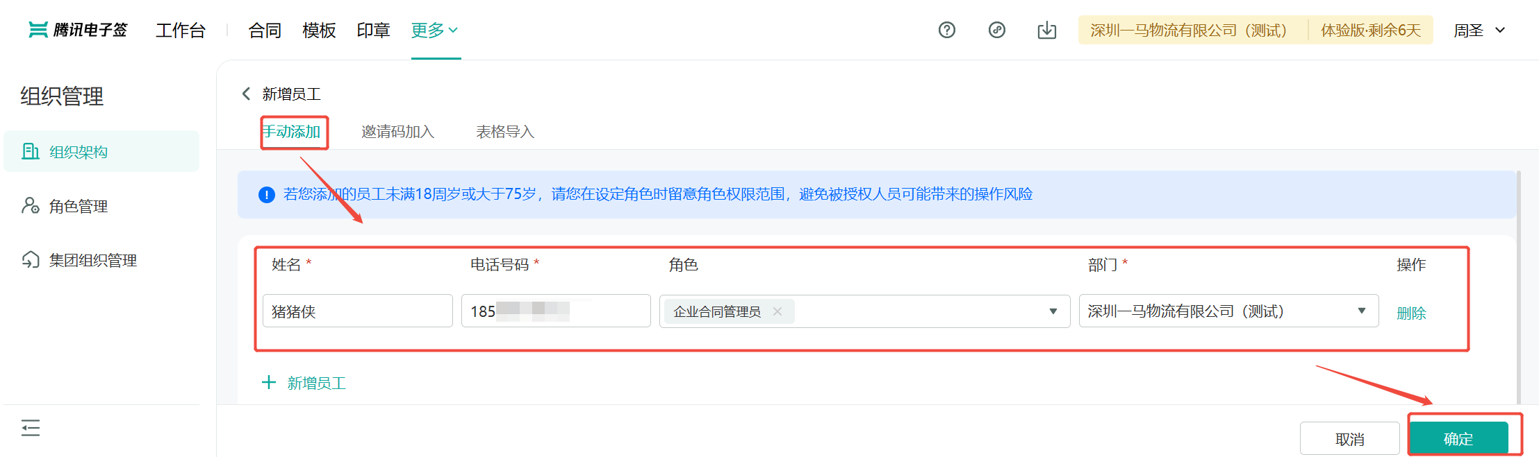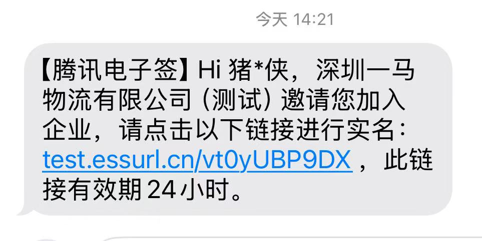 在页面中填写猪猪侠的手机号和姓名,点击 确定 后,猪猪侠将收到邀请加入企业的短信通知。猪猪侠点击短信中的链接,按照指引完成加入企业的申请。