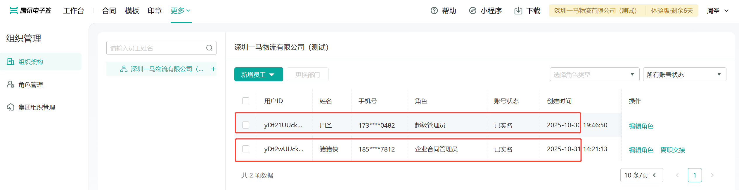 完成企业注册认证的员工将默认被赋予该企业的超级管理员身份,后续可根据需求进行变更,详情请参见变更企业超级管理员。