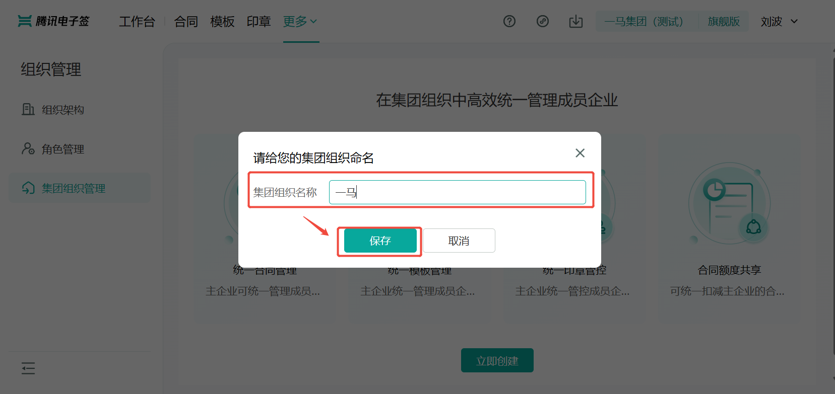 创建页面示例如下,我们输入集团组织名称“一马”,然后点击保存: