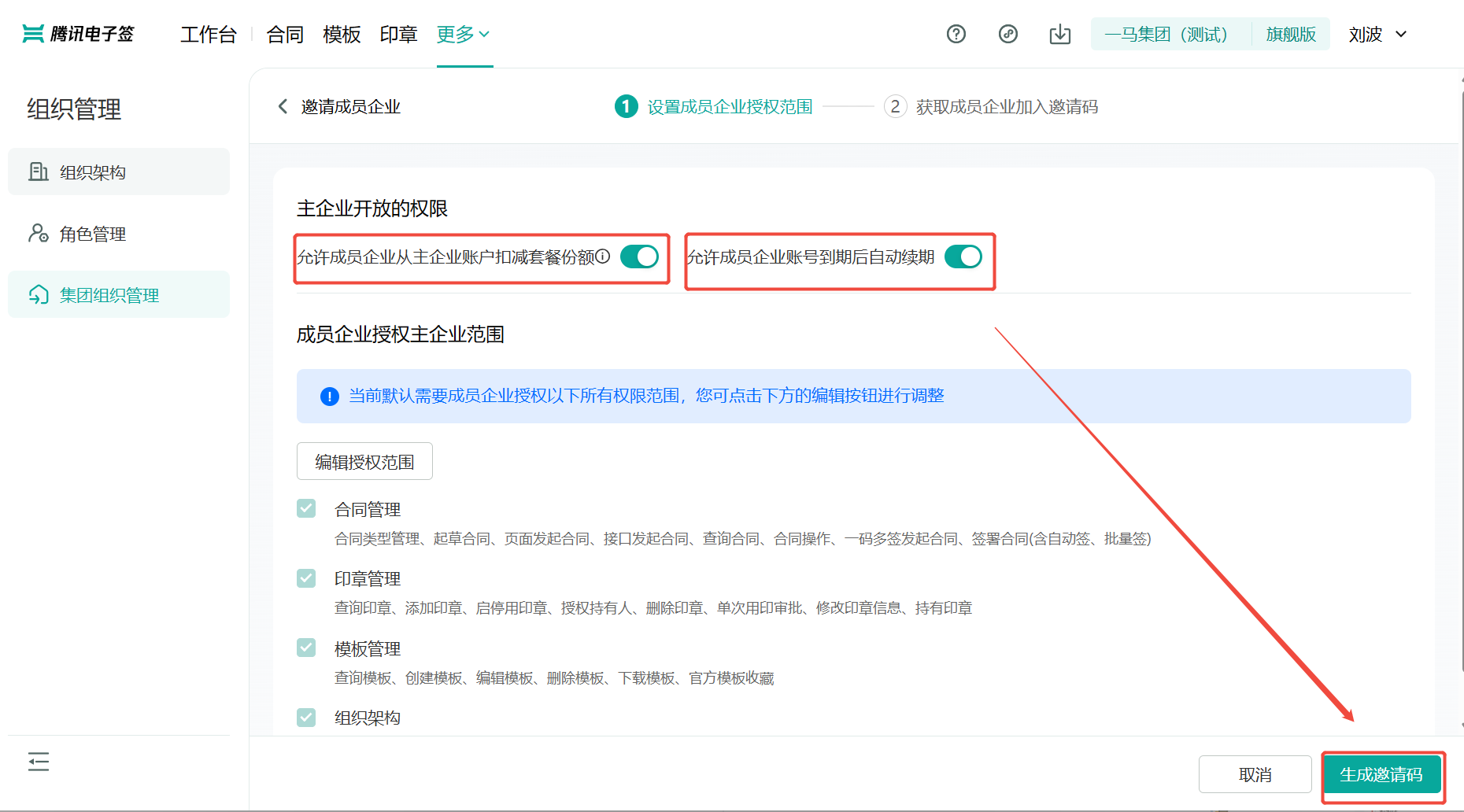 完成设置后,点击下方的 生成邀请码 按钮,即可获得子企业加入集团组织的邀请二维码。请将该二维码发送给目标子企业,由子企业的超级管理员扫码授权加入即可。