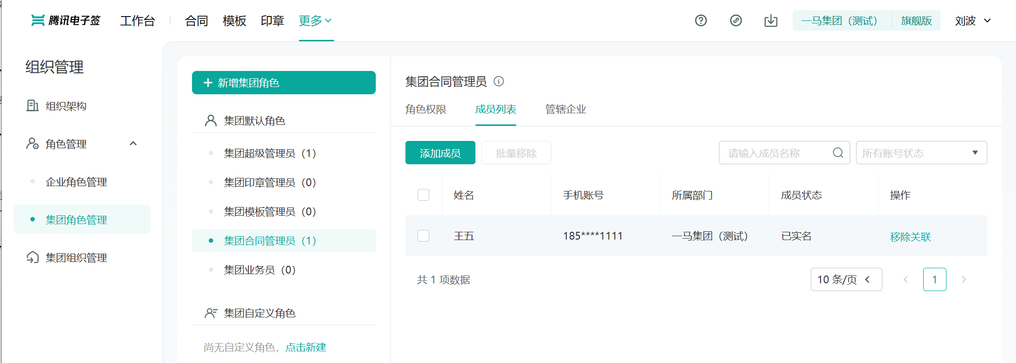 例如,我们给主企业员工王五授予了集团合同管理员的全局权限,赋权后他可以查看集团下所有子企业的合同,并能代表子企业发起和签署合同,界面示例如下: