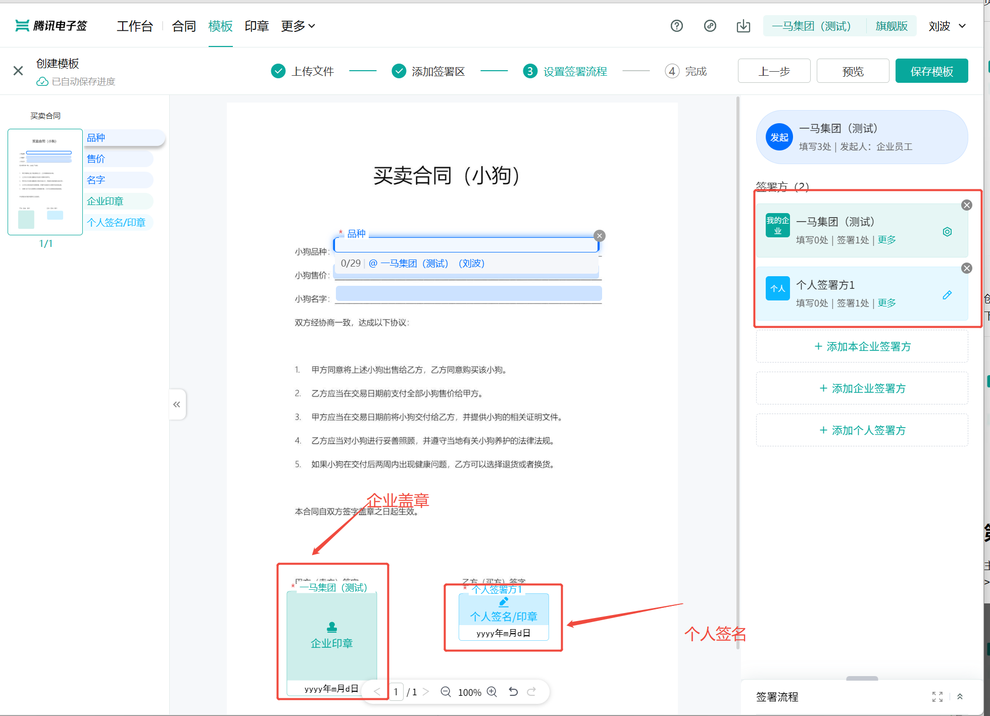 示例配置:两个签署方(本方企业 + 自然人),本方使用印章签署控件,自然人使用签名控件;发起方企业含三个填写控件(小狗的品种、售价、名字)。配置示意如下: