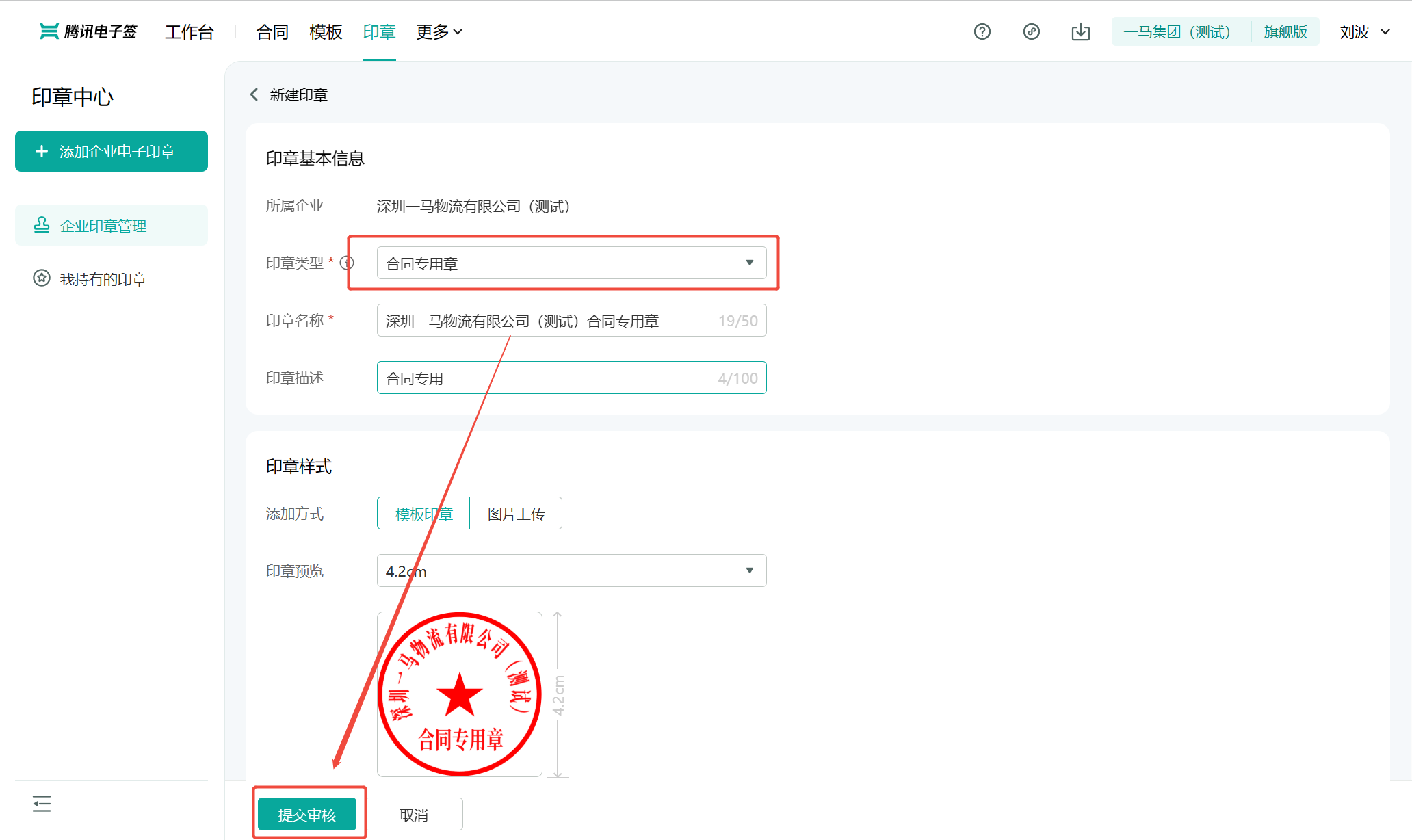 从列表中选择子企业“深圳一马物流有限公司”,点击 确定,进入为该子企业创建电子印章的页面。 在创建页面填写印章相关信息,确认无误后点击 提交审核,示例如下: