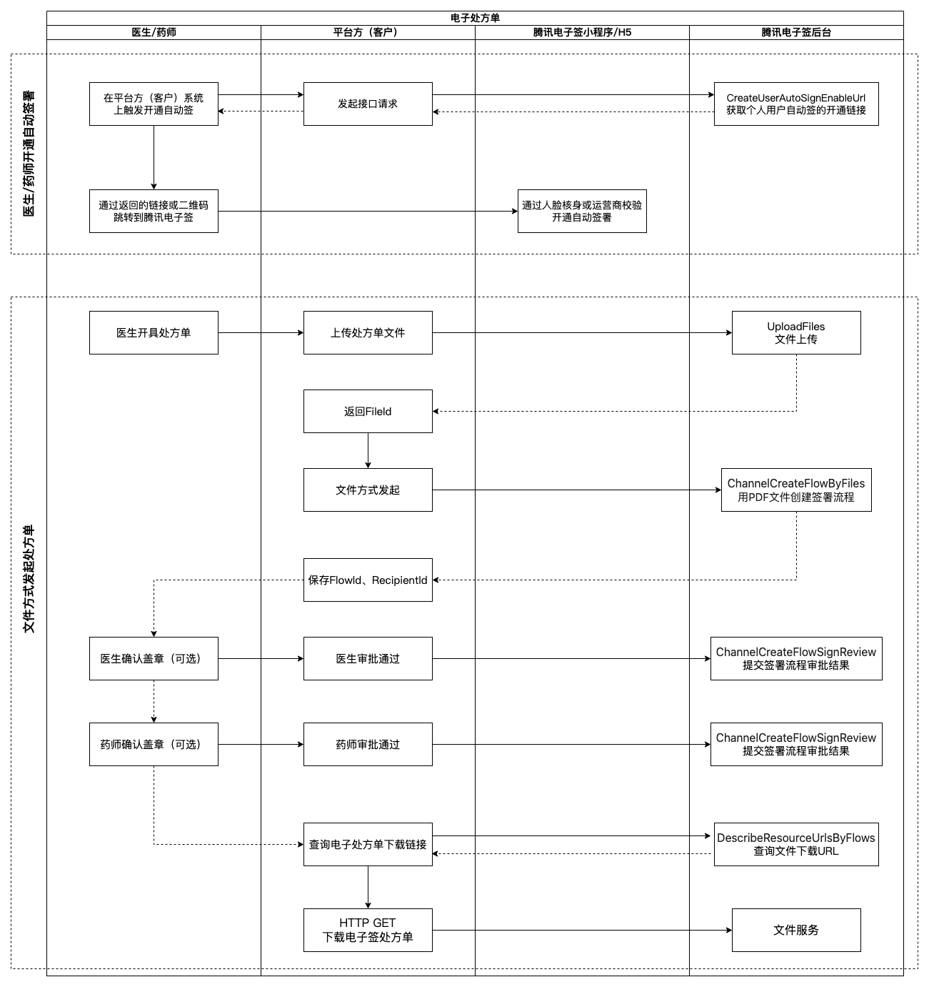 | ChannelCreateFlowSignReview | 如果希望医生或药师在审批之后才能自动签署,在发起合同时需设置相应签署方的ApproverNeedSignReview字段为true使其签署阻塞。医生/药师审批之后再通过ChannelCreateFlowSignReview接口通知电子签放开阻塞。 |