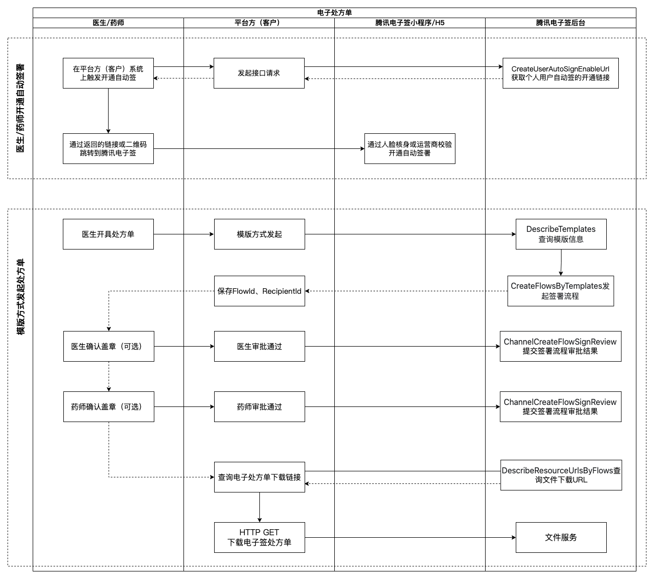 | ChannelCreateFlowSignReview | 如果希望医生或药师在审批之后才能自动签署,在发起合同时需设置相应签署方的ApproverNeedSignReview字段为true使其签署阻塞。医生/药师审批之后再通过ChannelCreateFlowSignReview接口通知电子签放开阻塞。 |